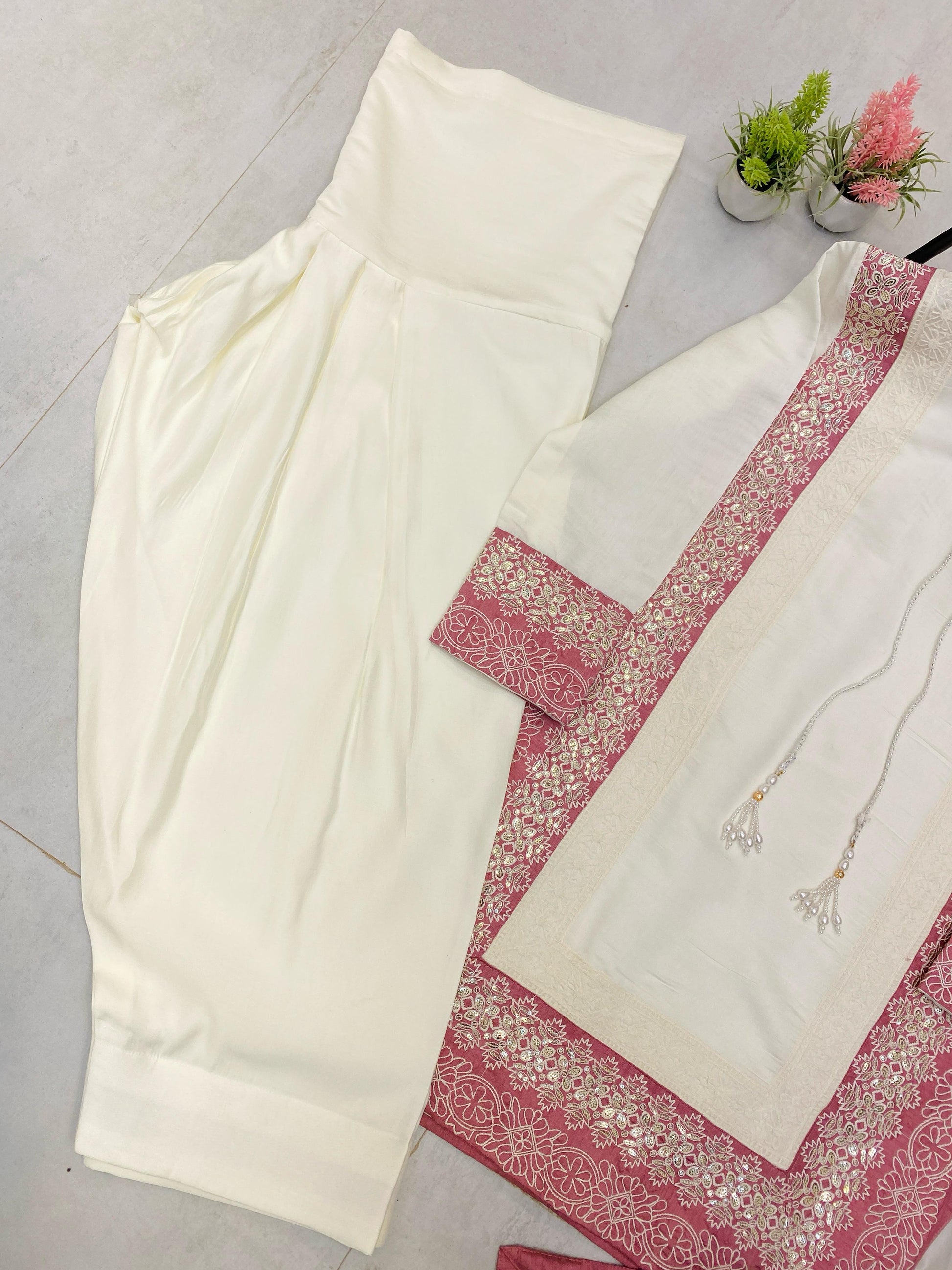# Work :sequence Embroidery On Mono Banglory Silk For Border And Pearl Tassels On Neck
