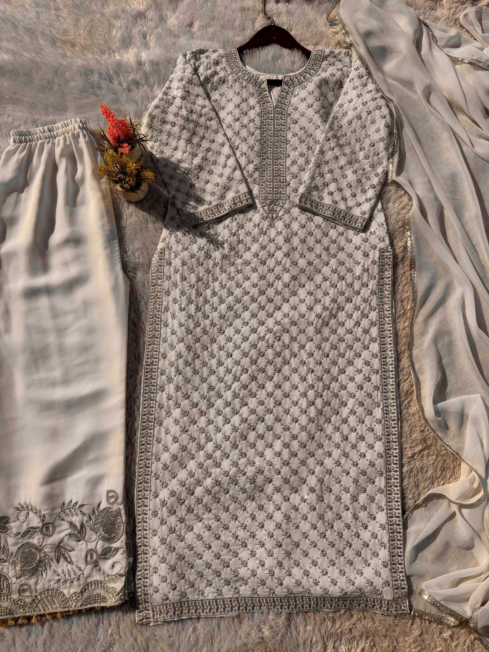 # WORK : SEQUENCE EMBROIDERY WORK WITH BORDER MOTI LACE WORK