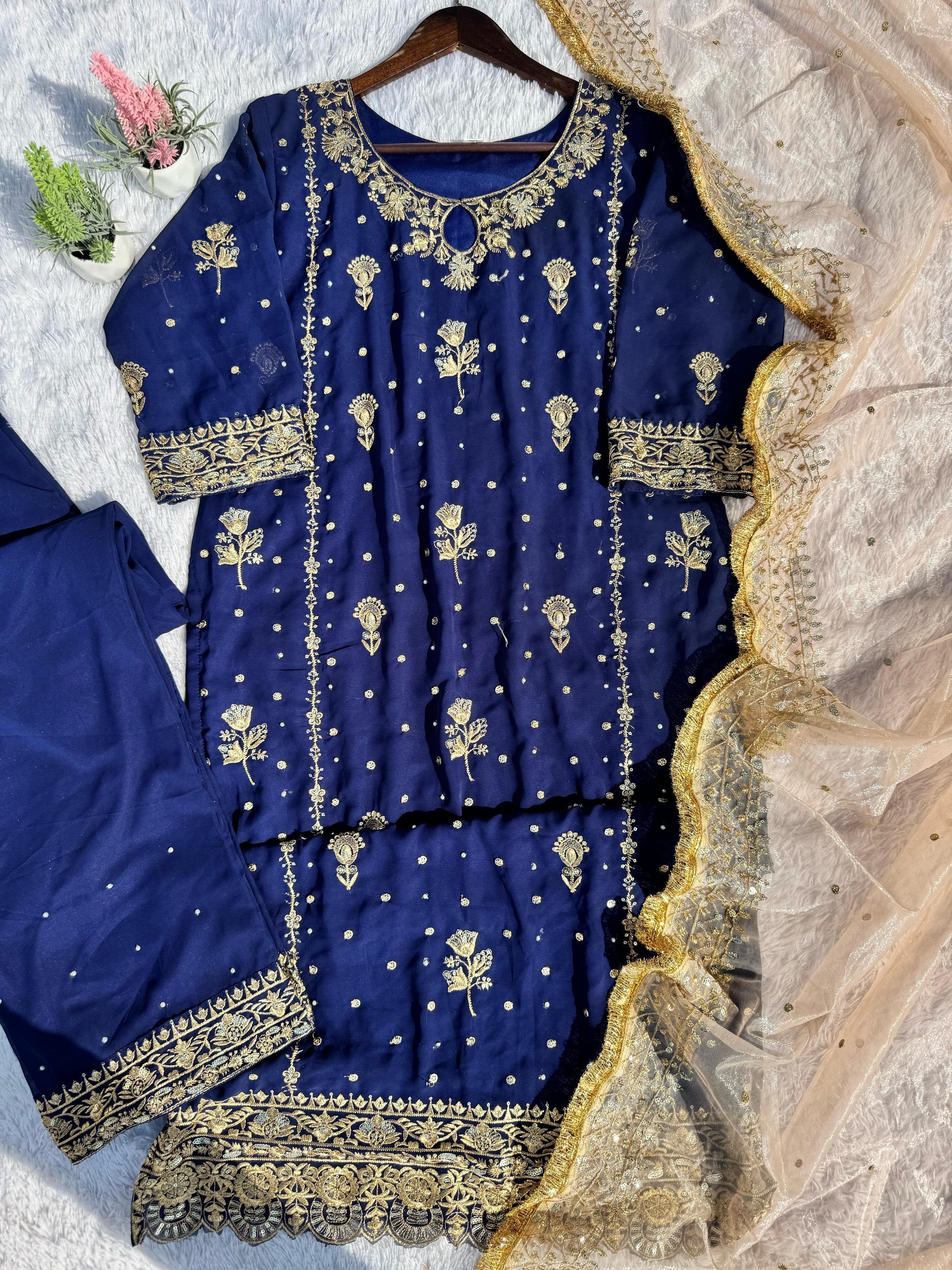 Silver Gold Net Sequence Embroidery Work With Border Heavy Lace Work Dupatta (2.2 Mtr)