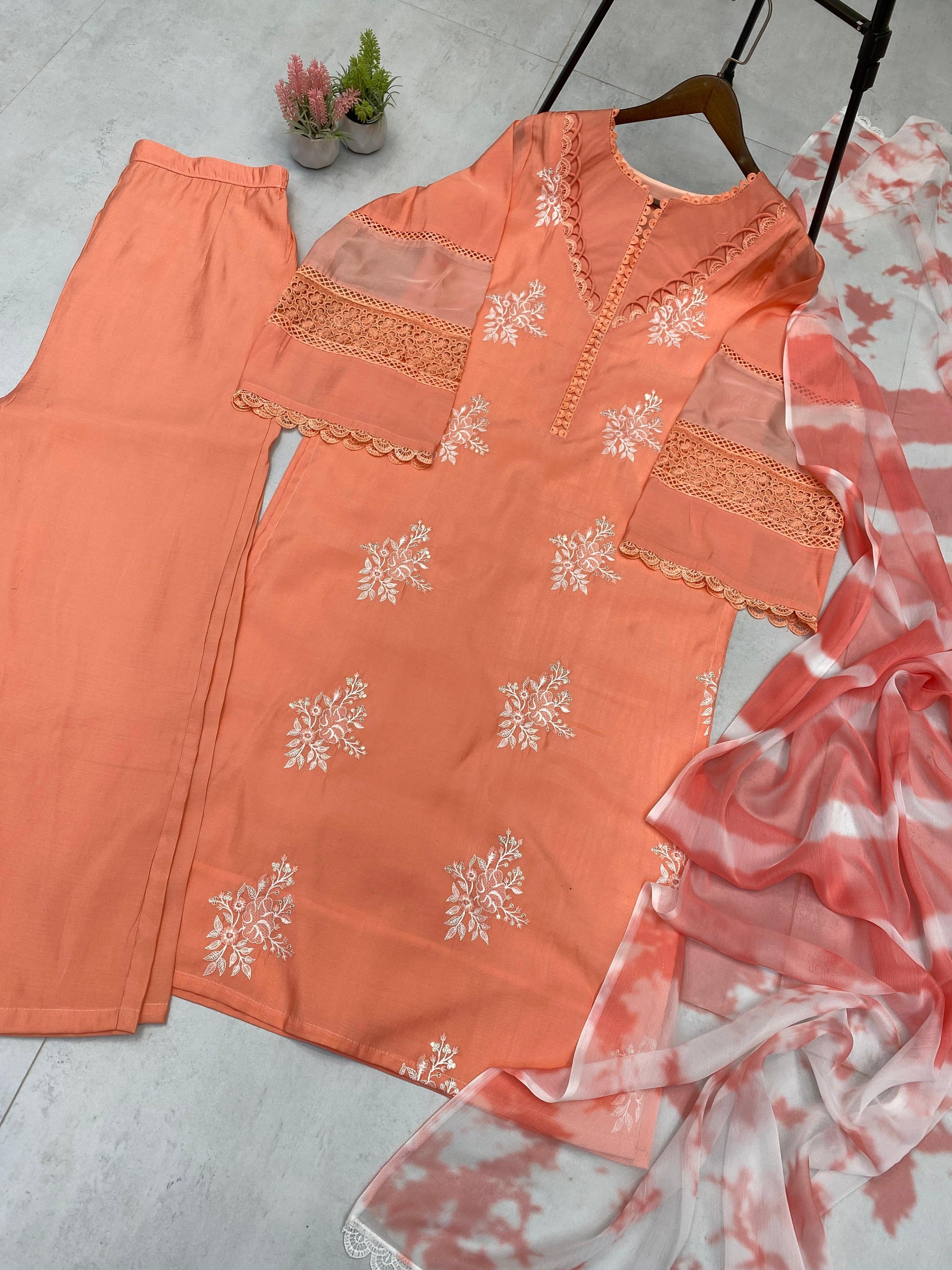 trendy peach color embroidery work straight salwar suit